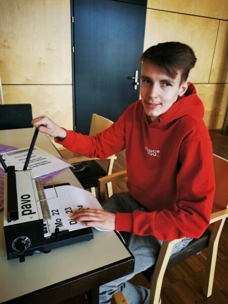 Außerdem beschäftigt der BSVT aktuell vier wertvolle blinde und sehbehinderte Mitarbeiter:innen. Auch unser Lehrling Alexander, der seit Geburt an sehbehindert ist, hat hier bei uns seinen Platz gefunden.