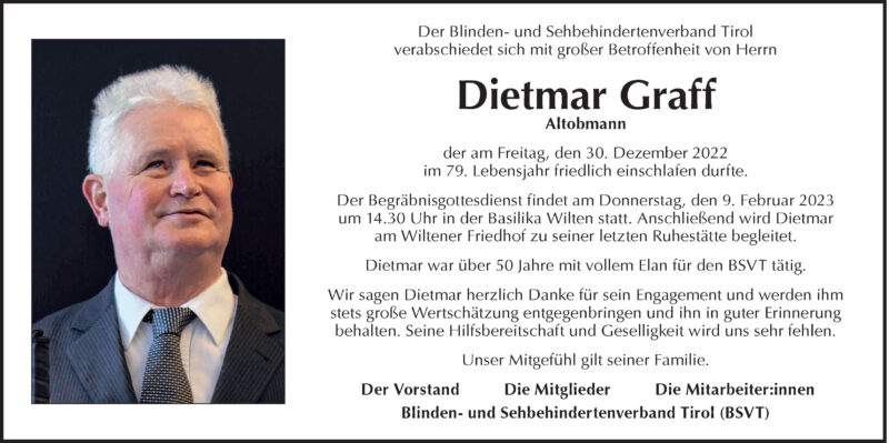 Der Blinden- und Sehbehindertenverband Tirol verabschiedet sich mit großer Betroffenheit von Herrn Dietmar Graff, Altobnann