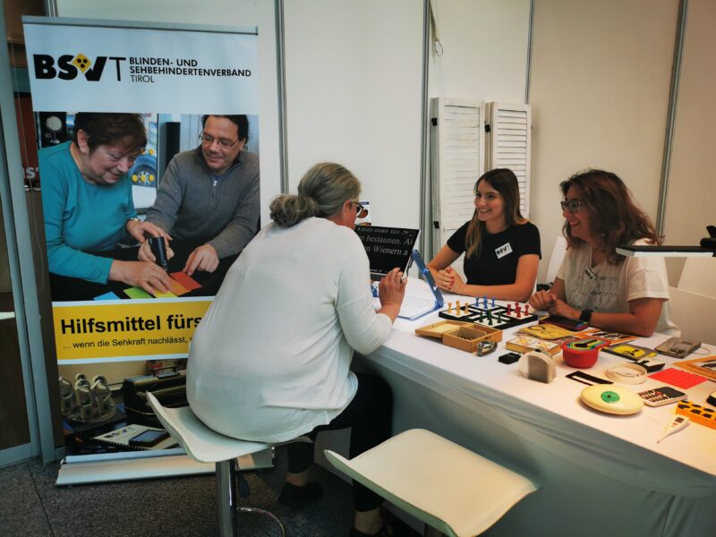 Das Team des BSVT war am 14. und 15. Juni bei den Gesundheitstagen 2023 in der Rathausgalerie mit einem Stand voller Hilfsmittel für blinde und sehbehinderte Menschen vertreten.